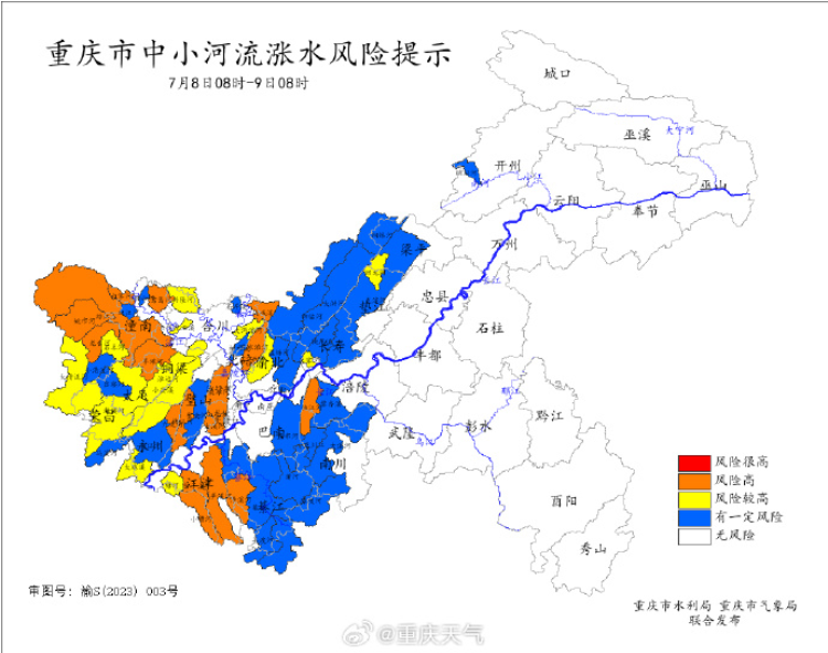 重庆市水利局和重庆市气象局7月8日8时联合发布中小河流涨水风险提示:预计,7月8日8时-9日8时,25个区县部分中小河流有涨水风险。