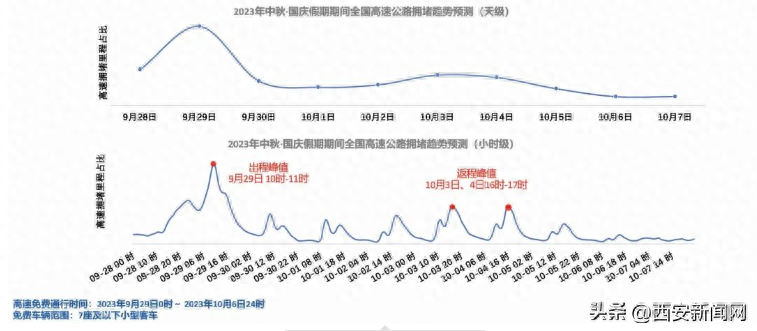 受中秋、国庆双节假期高速公路免费通行以及出行需求集中的影响,预计2023年9月28日15时开始,全国高速交通压力逐渐增大,9月28日21时-9月29日2时全国高速公路会有短时小高峰,9月29日9时-12时为高峰时段,峰值预计出现在10时-11时;而返程则较为分散,预计10月3日、4日15时-19时是高峰,尤其是16时-17时;预计10月6日起全国高速公路路况逐渐趋于平稳,7日恢复正常。