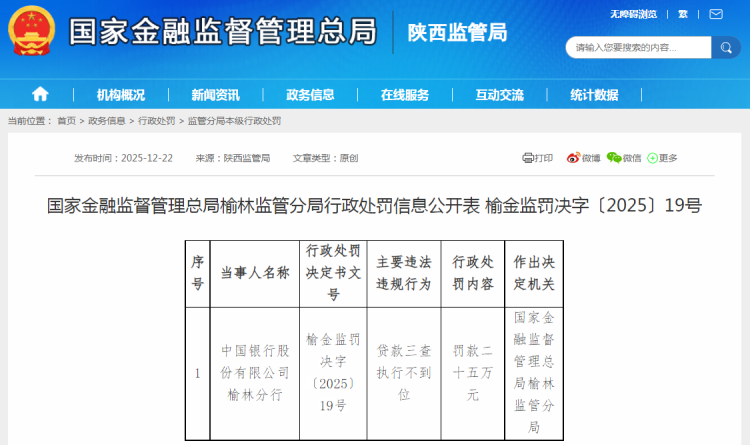 国家金融监督管理总局榆林监管分局行政处罚信息公开表(榆金监罚决字〔2025〕19号)显示,因“贷款三查执行不到位”,中国银行股份有限公司榆林分行被罚款二十五万元。