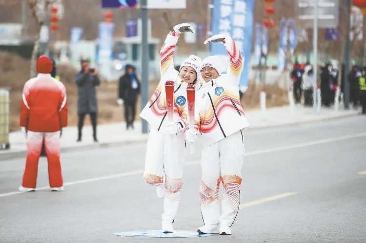 1月18日,景瑞雪(左)在火炬传递科创新城站中。