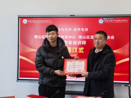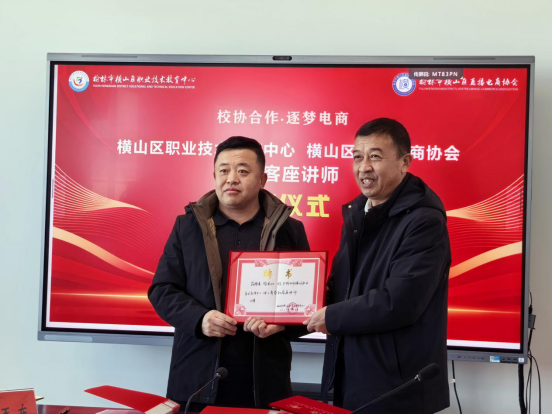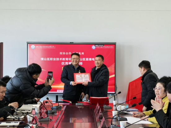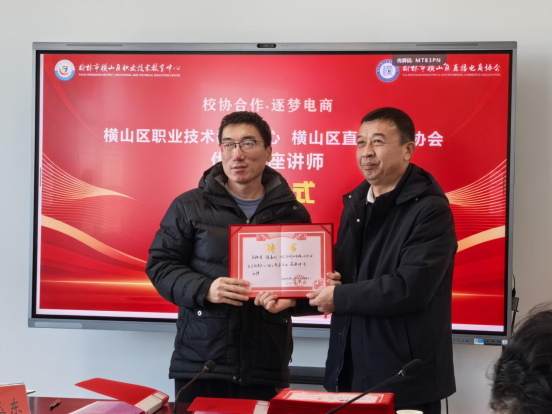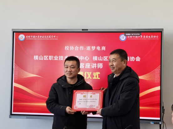 接着,横山区直播电商协会会长胡飞和横山职教中心副校长李怀平共同为“直播电商协会校协合作工作室”接牌,李怀平表示:“这一举措将加速我校实训资源升级,打造产教融合的典范。”