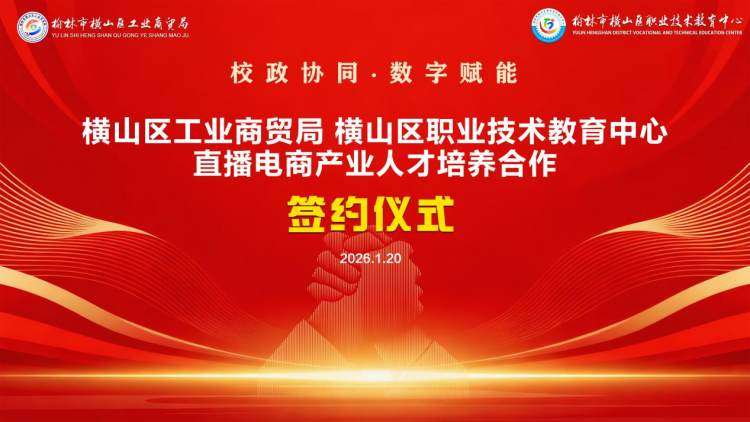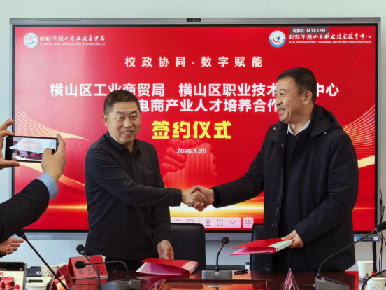 在全体嘉宾的见证下,横山区工贸局局长郑东山与职教中心校长韩生福共同签署协议。现场掌声雷动,象征着政校携手开启产教融合新篇章,为区域电商生态注入强心剂。
