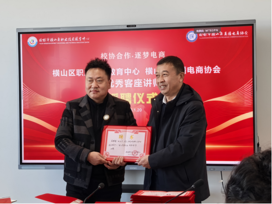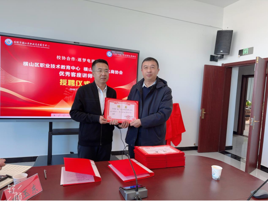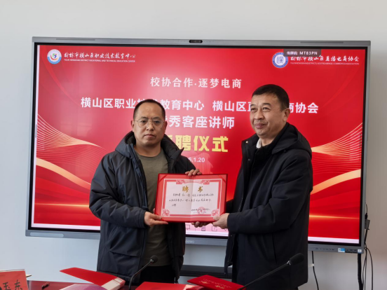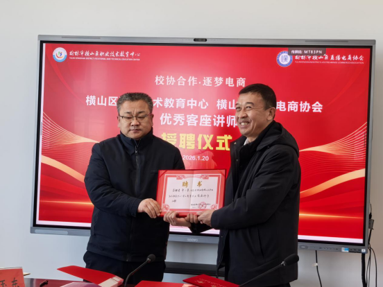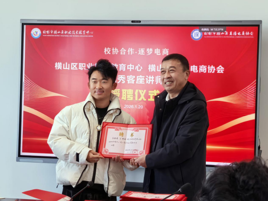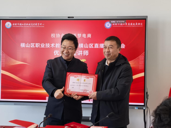 协议签署后,仪式进入资源融通环节。横山职教中心校长韩生福登台,现场颁发“客座讲师”聘书。这些受聘者不仅拥有丰富的实践经验和流量影响力,更在直播助农、文化传承中屡创佳绩。韩校长在颁证时强调:“聘任诸位专家,是将产业前沿智慧引入课堂的关键一步,将为电商专业学生注入鲜活力量。”