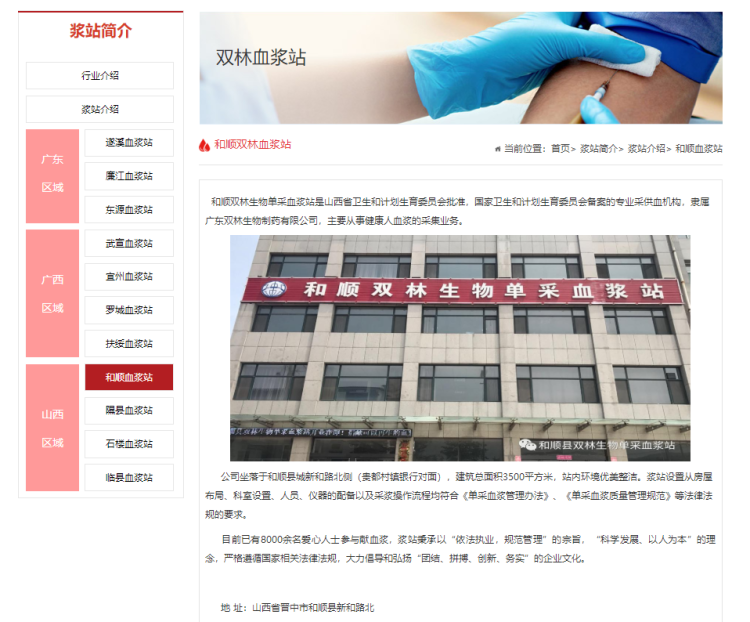 据双林单采血浆站官网介绍,广东双林生物制药有限公司,是一家集血液制品研发、生产和销售为一体的国家重点高新技术企业,也是我国通过国家GMP认证的血液制品定点生产企业,拥有3大类7个品种的生产能力,包括:人血白蛋白、静注人免疫球蛋白(pH4)、人免疫球蛋白、乙型肝炎人疫球蛋白、破伤风人免疫球蛋白、狂犬病人免疫球蛋白、人凝血因子VIII 。旗下在广东、广西、山西、新疆共拥有19家浆站。和顺双林生物单采血浆站属于该公司旗下浆站之一。