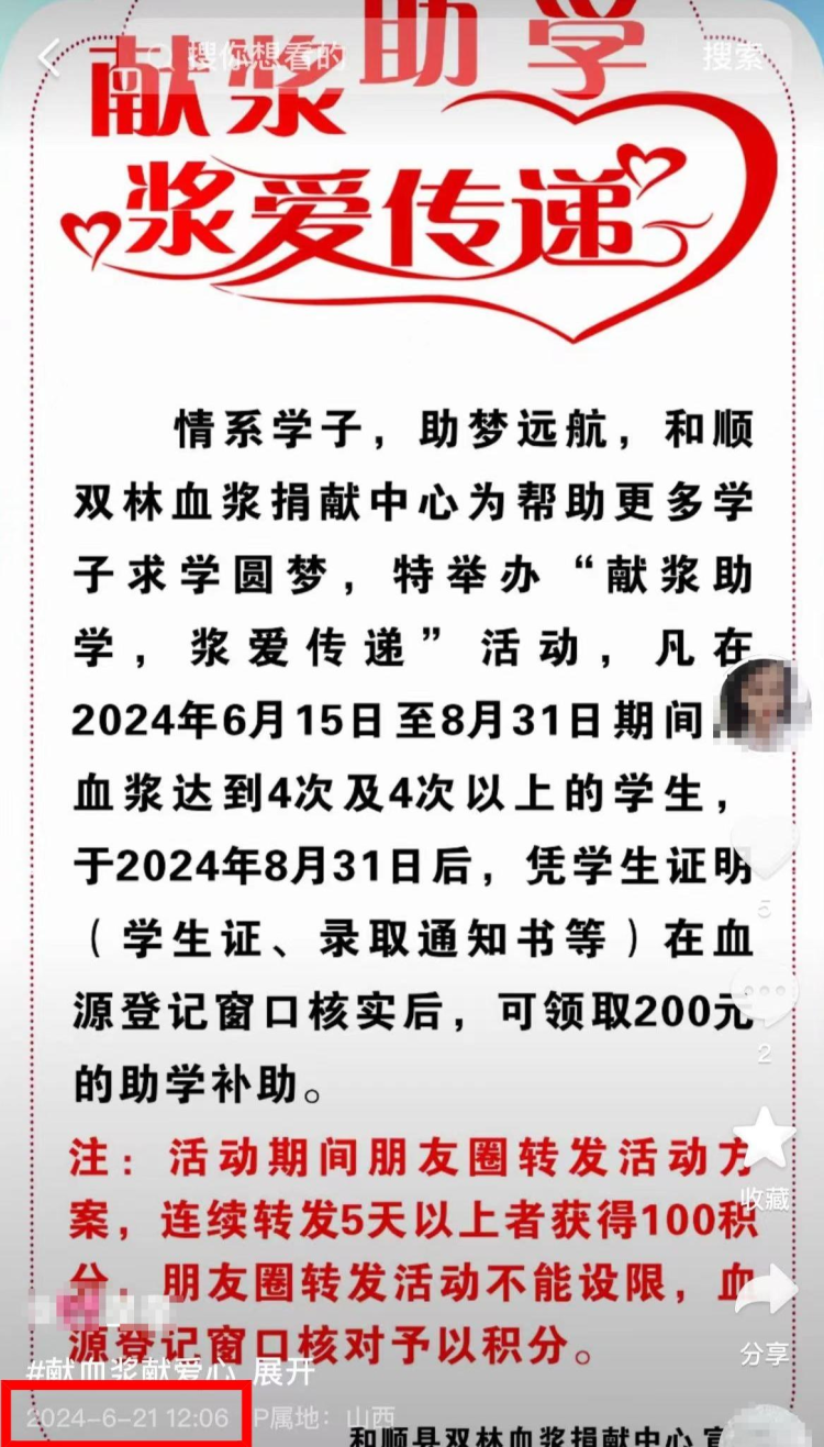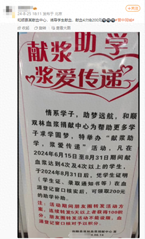8月25日,一则山西晋中和顺县双林血浆捐献中心,以200元“助学补助”邀请学生在2个半月内捐献4次及以上血浆的消息在网上流传,有网友质疑该活动存在诱导学生捐献行为。