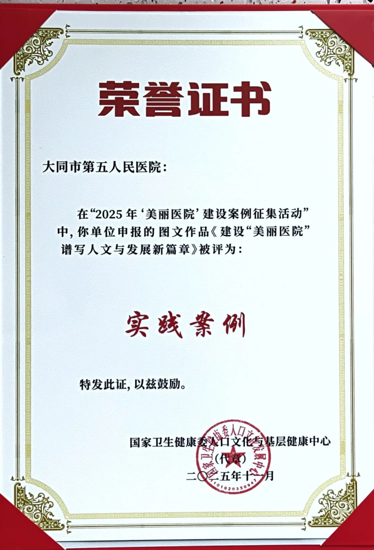 近日,由国家卫生健康委人口文化与基层健康中心主办的2025年“美丽医院”建设经验交流活动在浙江省湖州市成功举办。大同市第五人民医院报送的《建设“美丽医院”谱写人文与发展新篇章》从众多案例中脱颖而出,被评为实践案例奖。