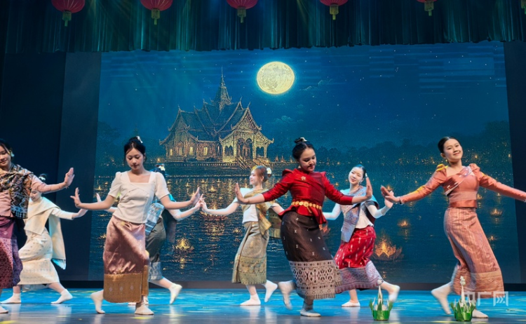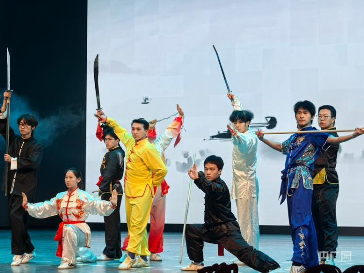 在激昂澎湃的管弦乐《龙腾虎跃》中晚会启幕,彰显出生机勃勃的中华气象。随后,多语种演绎的《青花瓷》巧妙融合古典风韵与国际多元素表达,“素胚勾勒出青花笔锋浓转淡,瓶身描绘的牡丹……”吟唱间尽显文明交融之美。武术表演《武耀星河》刚柔并济,太极、醉拳、刀棍相继登场,一招一式皆蕴藏着“动静皆宜,武以载道”的中国智慧。