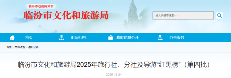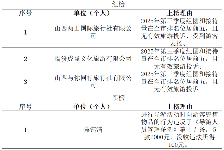 为进一步加强和规范旅行社市场经营行为,强化守信激励和失信惩戒力度,提高旅游行业和从业人员的诚信经营、诚信服务水平,提升旅游服务质量,按照《临汾市旅行社、分社及导游“红黑榜”制度(试行)》,现发布临汾市2025年旅行社、分社及导游“红黑榜”第四批,名单如下: