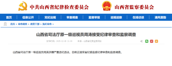 原标题:山西省司法厅原一级巡视员周涛接受纪律审查和监察调查