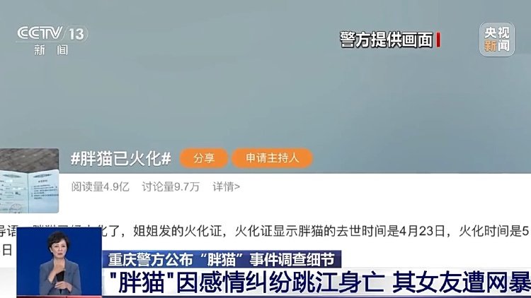 今年4月11日,一位网名叫“胖猫”的男子因感情问题在重庆跳江身亡,该事件随后在网络上持续发酵,各种形式的信息和言论层出不穷,而“胖猫”的女友谭某被视为利用感情骗取钱财,与此同时网上出现大量针对谭某的人肉搜索、造谣、谩骂等行为。5月19日,重庆警方公布了对该事件的调查结果,回应了公众关心的“胖猫”跳江身亡事件的细节。