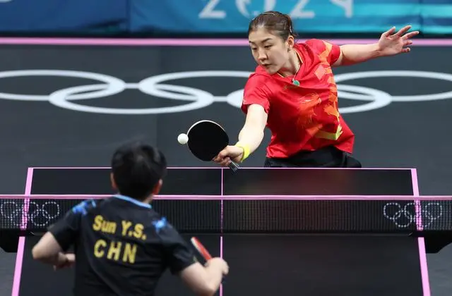 8月3日,陈梦与孙颖莎正在比赛。记者 刘续摄/新华社