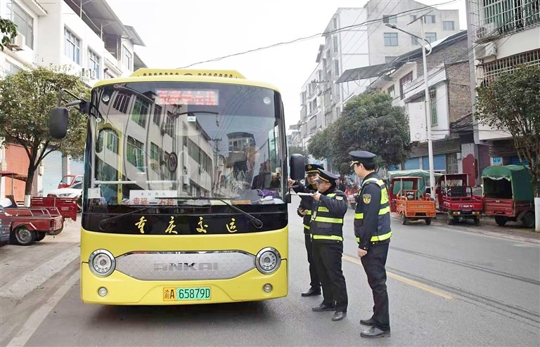 梁平区交通执法部门对跨省公交进行日常监督检查。图源 重庆法治报