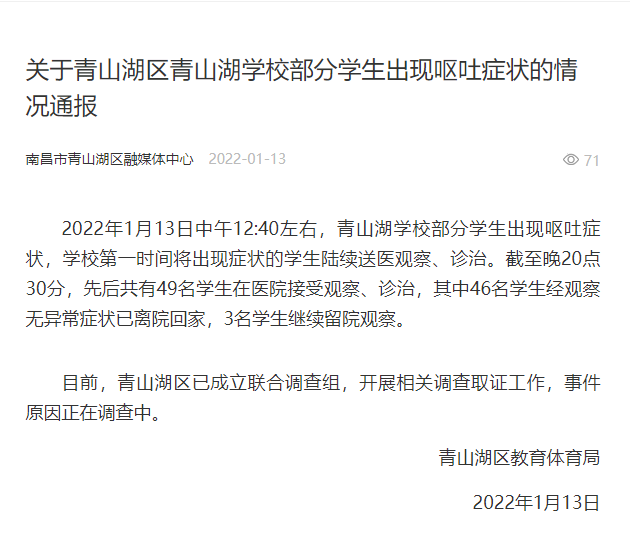 据“南昌市青山湖区融媒体中心”消息,2022年1月13日中午12时40分左右,南昌市青山湖学校部分学生出现呕吐症状,学校第一时间将出现症状的学生陆续送医观察、诊治。截至20时30分,先后共有49名学生在医院接受观察、诊治,其中46名学生经观察无异常症状已离院回家,3名学生继续留院观察。