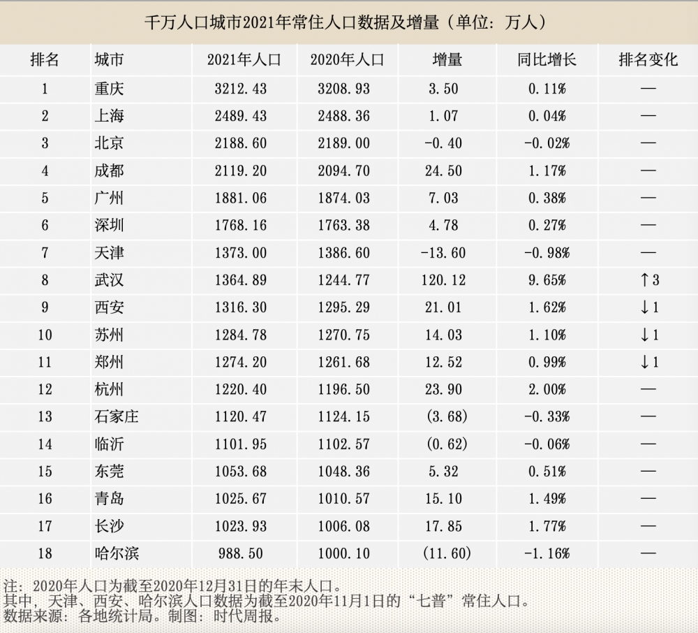 从排名来看,最大的变化就是,2020年常住人口位居第11位的武汉,在2021年以1364.89万人的“成绩”重回前10行列,位列第8。