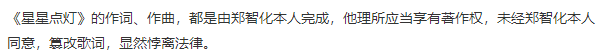 有律师称,根据《著作权法》规定,行使改编作品的著作权,不得侵犯原作品的著作权。《星星点灯》作词作曲均是郑智化先生,其对该作品享有修改权、改编权,以及享有保护作品不受歪曲、篡改的权利。