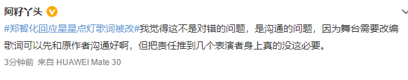 还有的网友认为:“这不是对错的问题,是沟通的问题,因为舞台需要改编歌词可以先和原作者沟通好啊,但把责任推到几个表演者身上真的没这必要”。