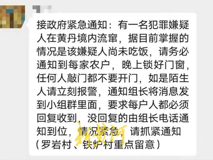 据新黄河客户端报道,案发当晚,一则网传“紧急通知”引起外界关注,称“有一名犯罪嫌疑人在黄丹境内流窜,据目前掌握的情况是该嫌疑人尚未吃饭,请务必通知到每家农户,晚上锁好门窗,任何人都不要开门。如是陌生人请立刻报警。通知组长将消息发到小组群里面……(罗岩村、铁炉村重点留意)”。