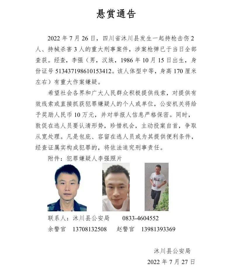 7月27日,沐川警方发布悬赏通报,对提供有效线索或直接抓获的奖励十万元。