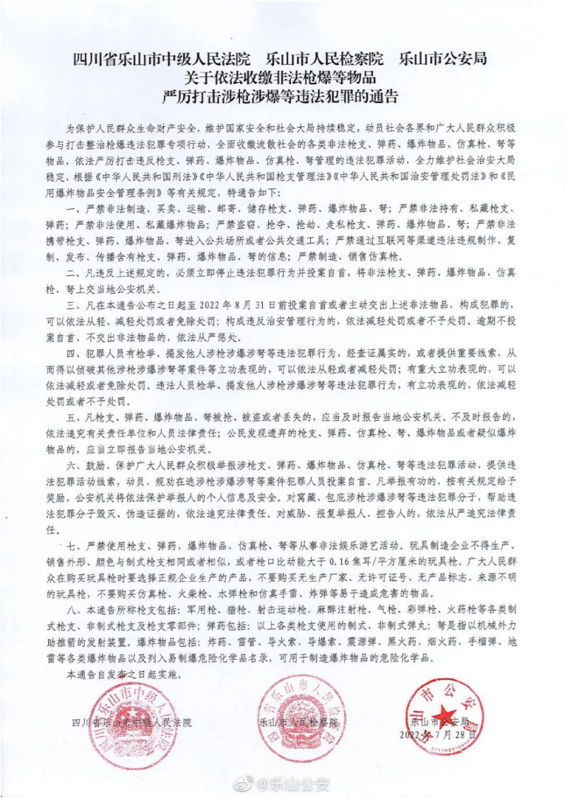 在会议召开的同一天,7月28日,乐山公安发布关于依法收缴非法枪爆等物品、严厉打击涉枪涉爆等违法犯罪的通告。
