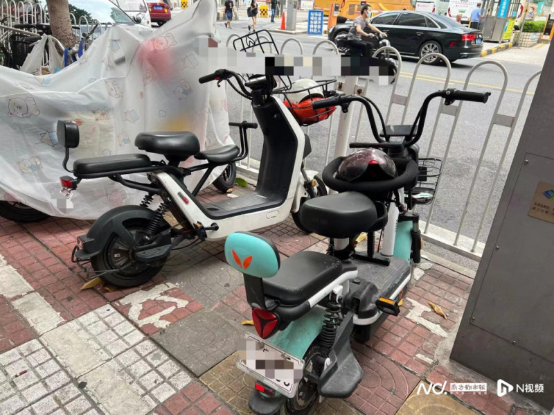 而记者在附近长达50多米的街道上,发现上百辆的电动自行车当中,未上牌的车辆仍占了一半左右。而已经上牌的车身上,大多有倒后镜、儿童座椅、挡雨棚、置物箱等明显是非法的加装物件。