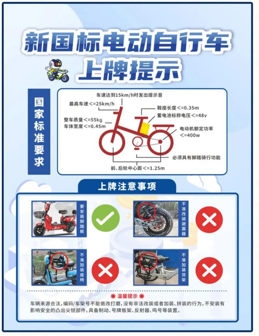 根据规定,电动自行车办理登记上牌时,车辆必须有脚踏骑行功能,车辆不得有改装避震器、加装座椅、货架等非法改装或者加装的行为。据广州交警今年7月份的通报,后台审核退办的不合规车辆约10万辆,现场查验审核不予通过的不合规车辆约3.5万辆。