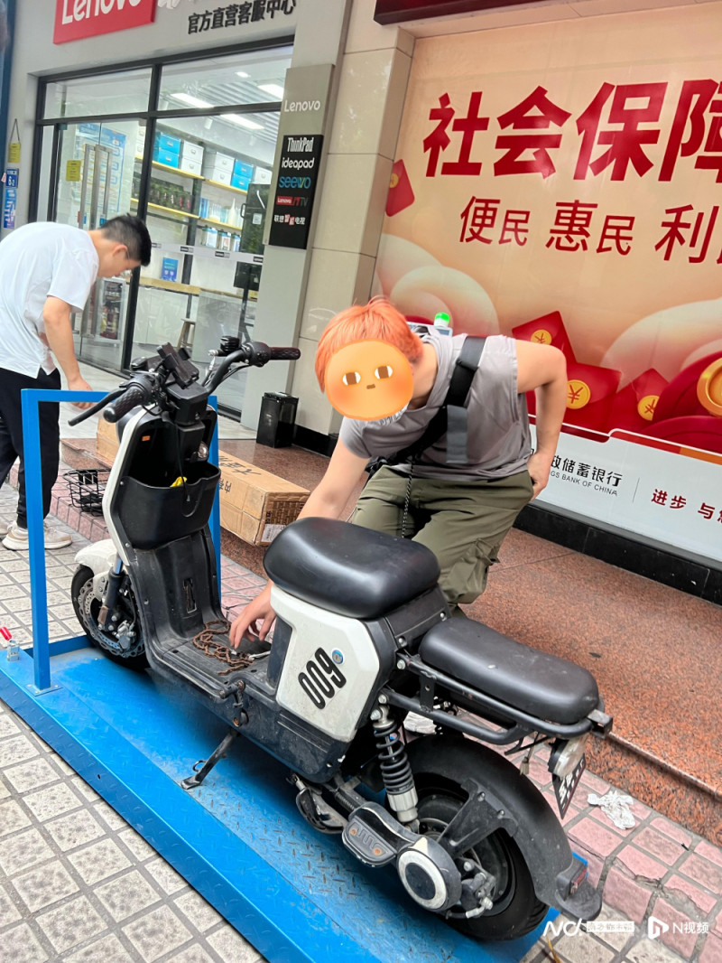 图:不少电动自行车车主前来上牌网点给车辆上牌,图中车辆正在称重,总重不超过55KG才能上牌。奥一新闻拍摄