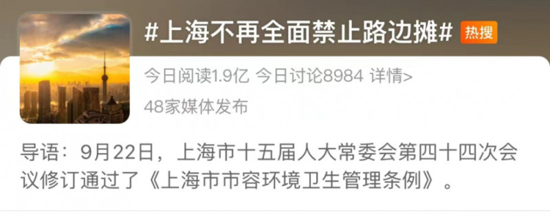 新民晚报微信公众号消息, 今早,上海不再全面禁止路边摊冲上热搜。