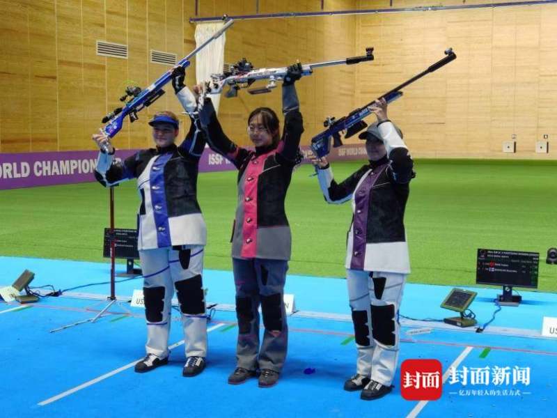 女子50米步枪三姿团体赛,和队友携手夺冠。