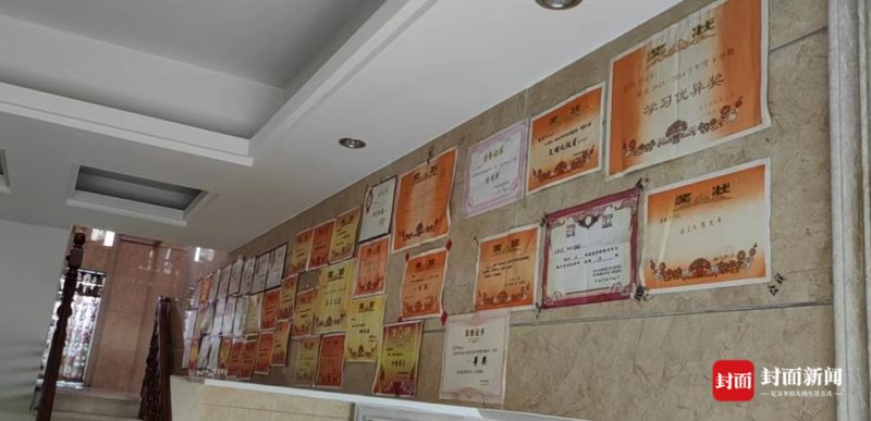 庞钰千家中,半壁墙贴满了她的各种奖状。