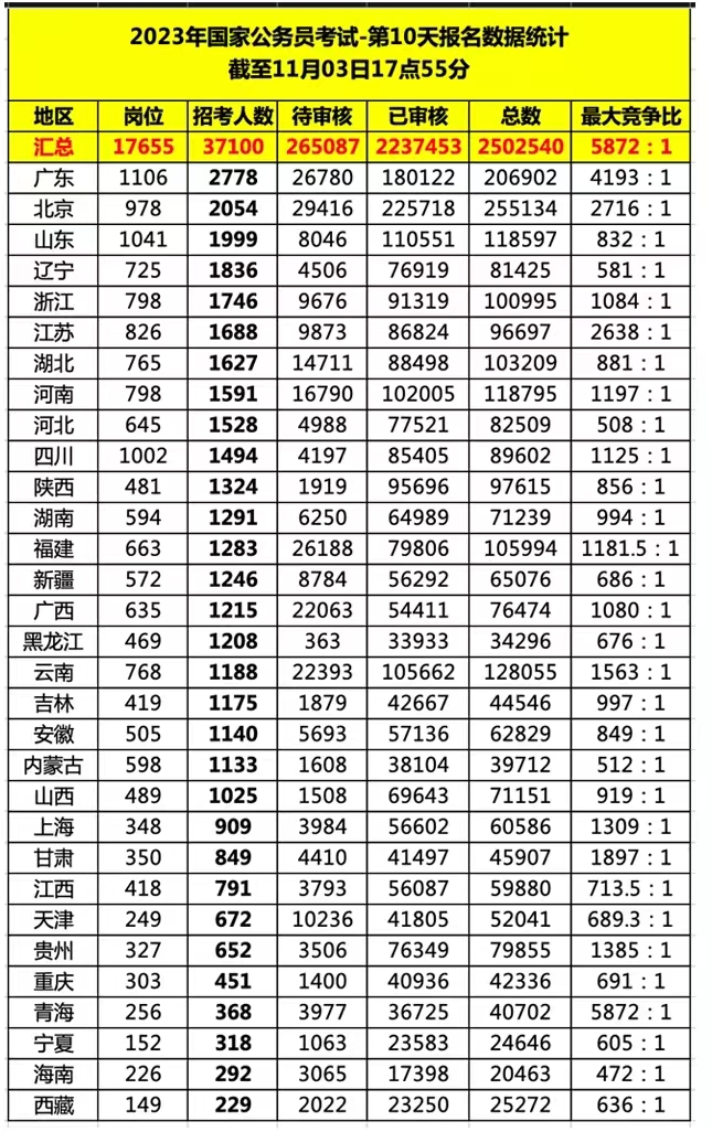 截至报名结束前五分钟,已有2237453人通过资格审核,相比前一天增长了将近60万人。各省数据当中,北京地区职位的报名人数达到255134人,位列榜首。广东省紧随其后,位列第二,报名人数达到206902人。云南省位列第三,报名人数达到128055人。