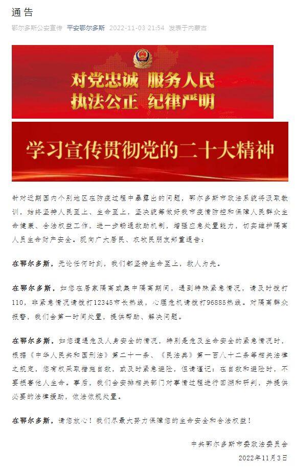 据“平安鄂尔多斯”微信公众号消息,中共鄂尔多斯市委政法委员会11月3日发布通告,针对近期国内个别地区在防疫过程中暴露出的问题,鄂尔多斯市政法系统将汲取教训,始终坚持人民至上、生命至上,坚决统筹做好我市疫情防控和保障人民群众生命健康、合法权益工作,进一步畅通救助机制,增强应急处置能力,切实维护隔离人员生命财产安全。现向广大居民、农牧民朋友郑重通告: