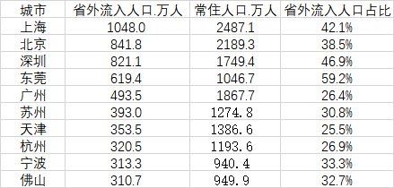 省外流入人口超过200万的城市有13个;超300万的有10个,分别是上海、北京、深圳、东莞、广州、苏州、天津、杭州、宁波和佛山,全部来自三大经济圈,其中既包括了上海、北京、天津三大直辖市,深圳、广州、杭州、宁波这四个副省级城市,还有东莞、苏州、佛山这三个制造业发展十分突出的普通地级市。