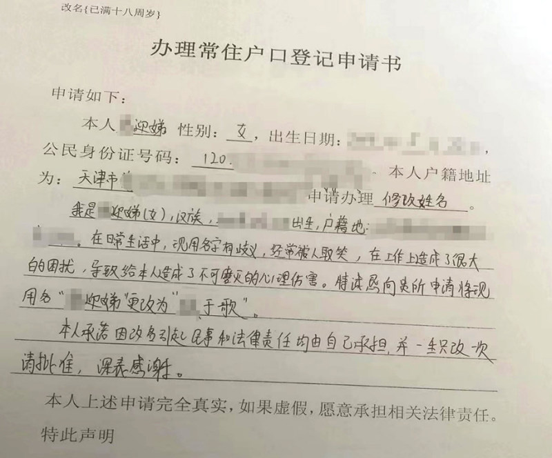 在《办理常住户口登记申请书》中,于歌写道,我是迎娣……在日常生活中,现用名字有歧义,经常被人取笑,在工作上造成了很大的困扰,导致给本人造成了不可磨灭的心理伤害,特诚恳向贵所申请将现用名“迎娣”更改为“于歌”。