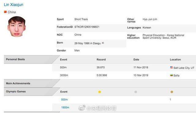 图说:北京时间7月12日,国际滑联官网更新短道速滑运动员林孝埈个人信息,国籍信息已从韩国更新为中国。