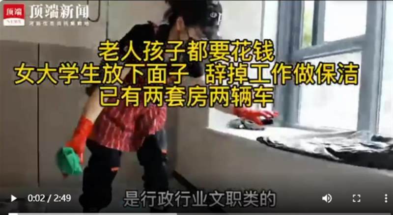 一位女大学生放下身段来干保洁,就像有硕士研究生送外卖一样,总是被人议论。就是因为社会上有一种对职业的偏见,认为这些工作不体面,导致当事人怕被人瞧不起。