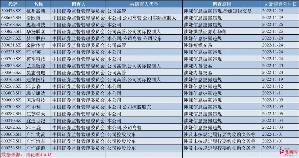从11月的数据来看,被立案调查的原因主要有涉嫌信息披露违规、涉嫌短线交易、涉嫌操纵证券市场、涉嫌内幕交易、涉及未按规定履行要约收购义务等。被调查对象则包括公司、高管、股东、实际控制人等。