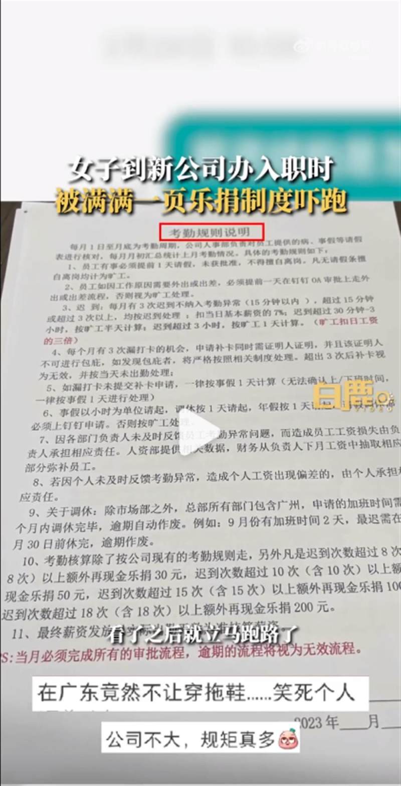 极目新闻消息,近日,广东广州的谢女士称,自己入职时看到办公室行政制度中的满满一页的“乐捐”制度,立刻被劝退了。虽然找工作有点心力交瘁,但谢女士表示,这种乐捐制度也是变相的罚款,提醒大家找工作时要注意。