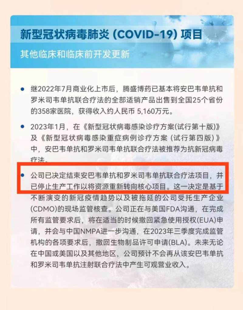 人民日报健康客户端消息,3月24日,腾盛博药发布2022年财报,其中提及,公司决定结束安巴韦单抗╱罗米司韦单抗联合疗法项目,并已停止生产工作。这也是我国首家也是目前唯一获批的自主知识产权新冠病毒中和抗体联合治疗药物。