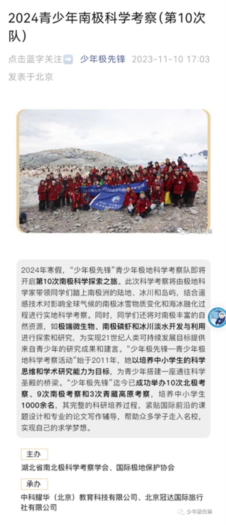 直到11月初,家长们发现,该公司同一法人代表的另一公司又以南极科学考察招揽生源,公司扮演活动承办方的角色,主办方为湖北省南北极科学考察协会和国际极地保护协会。