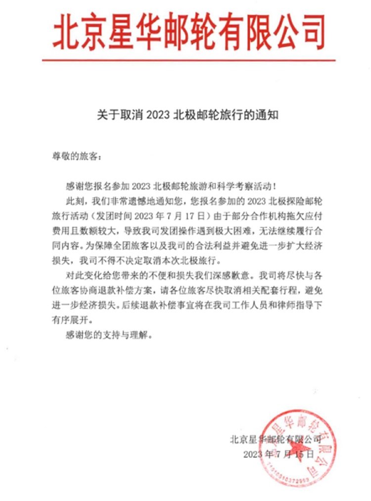 有家长提供的资料显示,7月15日,北京星华邮轮有限公司发布《关于取消2023北极邮轮旅行的通知》称:“由于部分合作机构拖欠应付费用且数额较大,导致我司发团操作遇到极大困难,无法继续履行合同内容”“不得不决定取消本次北极旅行”,并于两日后提出延期转团或取消退款方案。