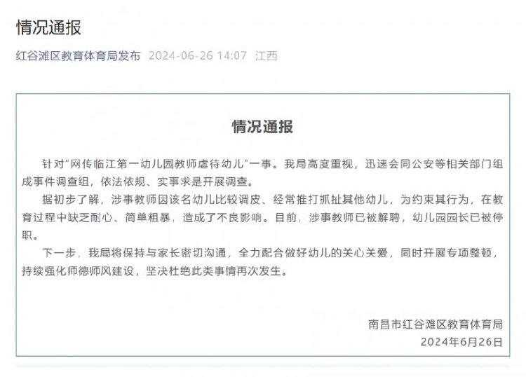 网传南昌一幼儿园教师虐待儿童 官方通报:解聘涉事教师,园长停职