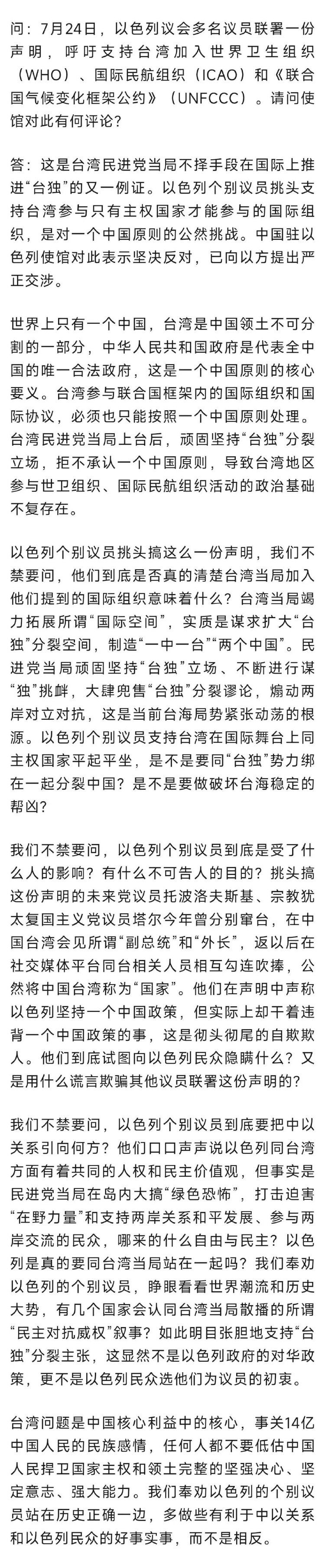 长安街知事消息,据中国驻以色列大使馆消息,7月25日,中国驻以色列使馆发言人就以色列个别议员挑头搞涉台声明答记者问。