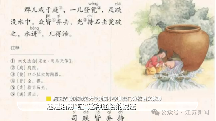 “司马光砸缸”改“砸瓮”也是被误传的。《宋史》记载的是司马光“破瓮救儿”,因为宋代的“瓮”指的是小口大腹的容器,“缸”是后世的泛称。实际上教材里还是沿用“缸”这种通俗的说法,只是会在注释里标注原文,这是兼顾了普及性和准确性。