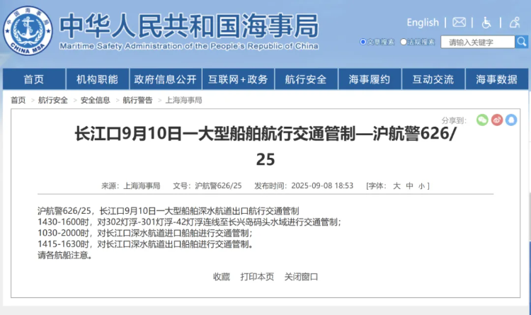 9月8日,上海海事局发布航行警告,预告本月10日将有船只通过“大型船舶深水航道出口”,时间在下午2时30分至4时30分之间。当时就有分析认为,这似乎就是福建舰将再次离港的信号。