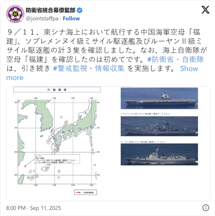 到了第二天中午,“解放军御用摄影师”的日本自卫队,发现福建舰与两艘驱逐舰出现在钓鱼岛西北约200公里的海域。日方称,这是首次观测到福建舰出现在相关海域。这不仅证实了外界对于福建舰出海的猜测,更是福建舰下水以来,最远的一次航行。