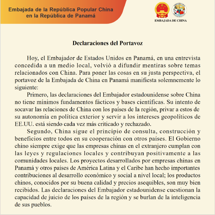 中国驻巴拿马大使馆消息,今天,美国驻巴拿马大使在接受当地媒体采访时又一次就涉华问题散布谎言。为以正视听,中国驻巴拿马使馆发言人严正声明如下: