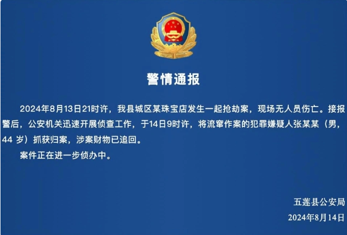 2024年8月13日21时许,我县城区某珠宝店发生一起抢劫案,现场无人员伤亡。接报警后,公安机关迅速开展侦查工作,于14日9时许,将流窜作案的犯罪嫌疑人张某某(男,44 岁)抓获归案,涉案财物已追回。案件正在进一步侦办中。