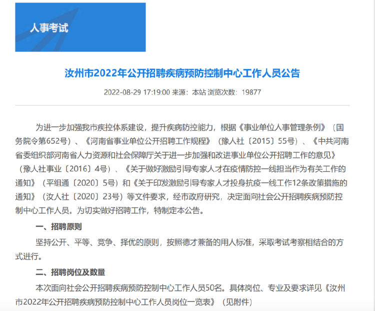 2022年8月,汝州市疾控中心发出公告,面向社会招聘50名财政全额预算事业单位工作人员(在编人员),考试由笔试和面试组成,成绩各占50%。