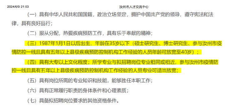 《汝州市2022年公开招聘疾病预防控制中心工作人员公告》的招聘范围和条件一项中提到:1987年1月1日以后出生,年龄在35岁以下(硕士研究生、博士研究生、参与汝州市疫情防控一线且具有五年以上县级疾病预防控制机构工作经验的人员年龄可放宽至40岁);具有大专以上文化程度;所学专业与拟招聘岗位专业相同或相近,参与汝州市疫情防控一线且具有五年以上县级疾病预防控制机构工作经验的人员专业可适当放宽。