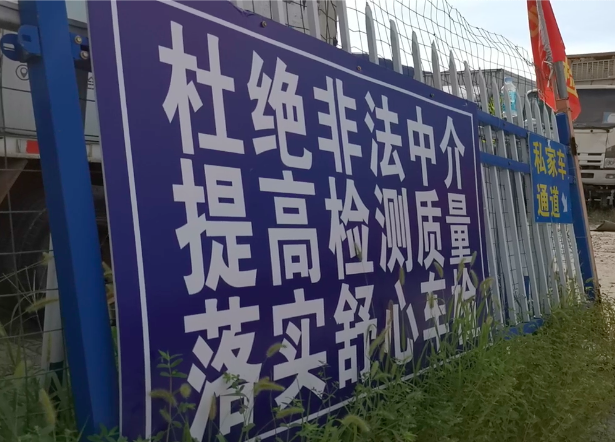 为源机动车检车站摆放着“杜绝非法中介的招牌”,但该站几乎每天都有多名中介聚集揽活儿。 新京报记者 程亚龙 摄